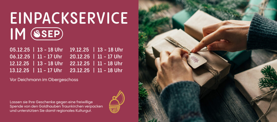 Die Goldhauben Traunkirchen helfen euch gegen eine kleine Spende beim Einpacken eurer Geschenke. Unseren Einpackservice findet ihr an folgenden Tagen vor Deichmann im OG: