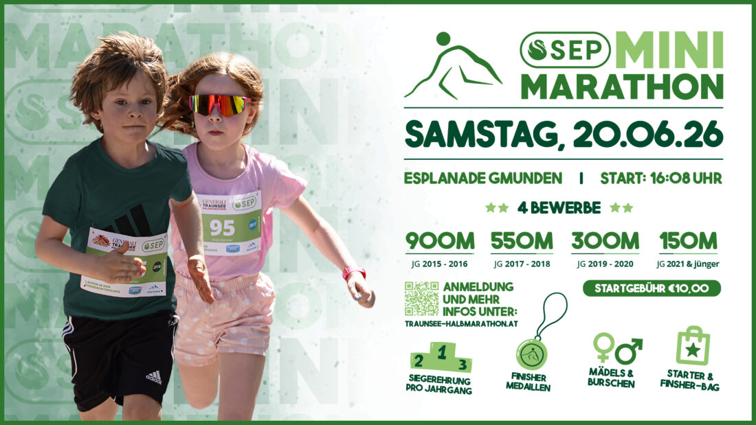 Teilnehmen können alle Kinder ab dem Jahrgang 2015 und jünger. Unterteilt werden die Jahrgänge in vier verschiedene Wettbewerbe und Distanzen. Der SEP Mini Marathon findet im Rahmen des Generali Traunsee Halbmarathons, am Samstag, den 20. Juni 2026 auf der Esplanade in Gmunden statt. Der Start erfolgt um 16:08 Uhr und somit drei Stunden vor dem Start der „Großen“. Der 900m-Bewerb der Jahrgänge 2015 und 2016 startet als erster um 16:08 Uhr beim Yachtclub Gmunden. Mit einem Abstand von ungefähr 10-15 Minuten erfolgen die Starts für die weiteren Bewerbe! Der 150m-Bewerb für den Jahrgang 2021 und jünger startet um ca. 17:10 Uhr Gleich im Anschluss findet um ca. 17:15 die Siegerehrung auf „der Bühne der Großen“ statt.